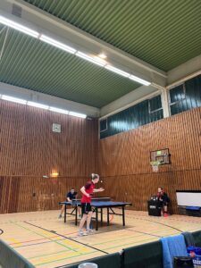 Den Schwung aus dem Doppel nahm Samuel direkt in dasEinzel mit. In der Hinrunde bislang eher noch etwas auf Formsuche, war der Autor hoch motiviert, seinen Sieg aus der Relegation gegen Sonja Schubert zu wiederholen. Dementsprechend legte er auch los, gewann den ersten Satz mit einer spektakulären „Vorhandschussrallye“ und ließ anschließend auch zunächst nicht nach. Selbst bei 7:10 Rückstand im 4. Satz gelang es ihm schließlich noch, den Satz und damit das Spiel für sich zu entscheiden.