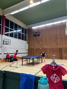 Ziwschenstand: 5:1 (zwischenzeitlich sogar 5:0) – da könnte der ein oder andere auf die Idee kommen, dass das Spiel ja schon quasi entschieden ist. Aber so funktioniert Tischtennis leider nicht. Finn brauchte zwei Sätze, um sich auf das Druckspiel von Sonja Schubert einzustellen, entschied dann aber mit zwischenzeitlich spektakulären Rallyes die nächsten zwei Sätze denkbar knapp für sich (11:9 und 14:12). Im 5. Satz legte er nach und lag bereits 5:2 vorne – doch ein taktisch tödliches Timeout seiner Gegnerin brachte schließlich die Wende (2:3).