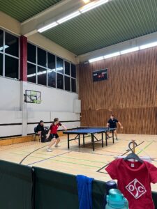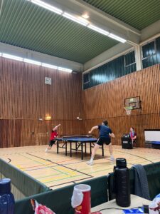 Auch unten zeigte zunächst alles in unsere Richtung. Philipp spielte gegen Löhner sein gewohnt starkes Angriffsspiel und ließ seinem Gegner phasenweise gar keine Chance (3:1). Auf die Frage seines Kontrahenten, was man denn bittschön gegen solche Vorhandtopspins machen solle, weiß der Autor in seinen Duellen gegen Philipp leider auch keine Antwort – wenn jemand eine Idee hat, bitte melden!