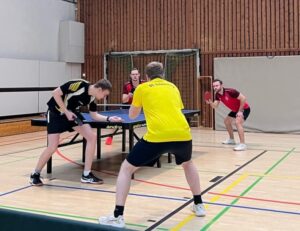 Das zahlte sich für uns tatsächlich direkt aus: Jonas spielte mit Finn ein sehr starkes Doppel gegen Lukas und Alex und brachte vor allem im 4. Satz das Spiel fast im Alleingang über die Ziellinie (3:1). Auf der anderen Seite gewannen Philipp und Julian ähnlich überzeugend gegen Adrian und Frederik (3:1).