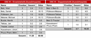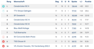 - Bei insgesamt elf Matches in eigener Halle (die internen „AuswĂ€rtsduelle“ mit einberechnet) stehen wir bei 6 Siegen, 3 Unentschieden und 2 Niederlagen (OSC II & TSG Dissen III) – 15:7 Punkte und ein SpielverhĂ€ltnis von +18.