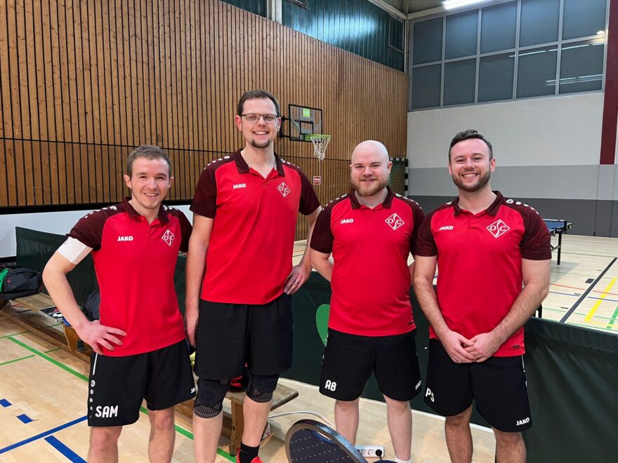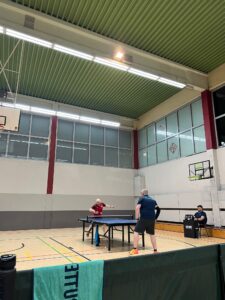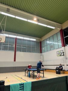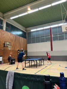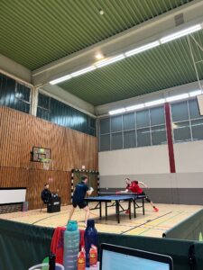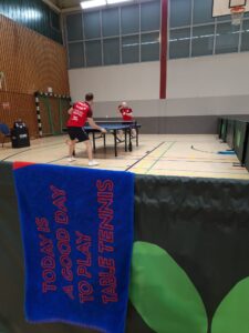 Endstand 8:2. An dieser Stelle natürlich Shoutout an den Support von der Seitenlinie. Zwar musste Coach Minh kurzfristig nach Übersee verreisen, allerdings war natürlich Laureen am Start. Und auch Quasi-Neuzugang Maret, die trotz ihrer lediglich halboffiziellen Vereinsmitgliedschaft und latentem Unistress bereits eine beeindruckende Hallenpräsenz aufzeigen kann, ließ es sich nicht nehmen, sich das Ganze einmal anzusehen – und anschließend noch selbst den Schläger in die Hand zu nehmen. Der Abend war schließlich noch lange nicht vorbei, denn mit Kaltgetränken und neugebauten Schlägern wurde kurzerhand weitergezockt. Die Erkenntnisse des Abends: Laureen ist den anderen an der Platte durchaus ebenbürtig, sofern alle anderen mit der falschen Hand spielen; Schlagzeuger Adrian hat eine bessere Augen-Hand-Koordination als der Rest und kann auch mit der falschen Hand halbwegs über den Ball gehen; und Maret kann auch in Jeans und Pulli Tischtennis spielen und selbst mit der linken Hand den Ball schießen. Und der Autor, joa, der war auch dabei 😉