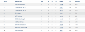 Durch den 7:3-Sieg haben wir weiterhin alles in der Hand, auch die Herbstmeisterschaft. Nötig dazu sind zwei Siege, die wir in einer guten Woche auswärts gegen Dodesheide II (8. Dezember) und Schölerberg II (9. Dezember) einholen wollen. Das werden mit Sicherheit keine Selbstläufer – vor allem, weil wir bis dahin erst einmal hoffen mĂĽssen, verletzungsfrei in die Spiele gehen zu können (GerĂĽchten zufolge leiden 3 von 5 Spielern an Dauer-Wehwehchen). Aber wir sind wie immer guter Dinge 🙂