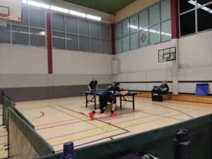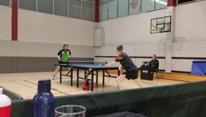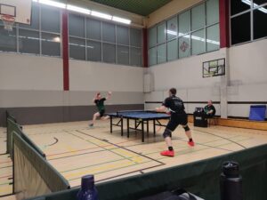 Der vermeintlich eindeutige Zwischenstand 5:1 kam uns vom vergangenen Freitag wohlbekannt vor, und tatsächlich drohte die Partie kurz zu kippen. Philipp haderte lange mit dem recht schnittlosen Spiel seines Gegners, weshalb es ihm letztendlich nicht gelang, sein Offensivspiel gegen Köhne auf die Platte zu bringen (1:3). Sein Ausflug ins obere Paarkreuz, fĂĽr das er doch eigentlich mehr als geeignet ist, wurde an diesem Abend leider nicht belohnt. Der Autor und Minh hatten kurz ein DĂ©jĂ -vu: Bitte nicht schon wieder eine FĂĽhrung herschenken. Das machte den Entscheidungssatz im Parallelspiel direkt umso interessanter. Finn lieferte sich mit KrĂĽger ein packendes Duell, in dem er mit einem Topspin nach dem anderen seinen Gegner immer wieder in die Defensive drängen konnte. Unsere Nr. 1 zeigte an diesem Abend, wozu sie in der Lage sein kann, und lieĂź sich auch nicht aus der Ruhe bringen, nachdem er beim Stand von 9:7 einen Ball zu frĂĽh bejubelte, der dann auf seiner Seite doch noch ganz hinten in der Ecke einschlug. Doch Finn behielt die Nerven, spielte zwei weitere starke Punkte aus und belohnte sich letztendlich mit einem knappen Sieg – und der Vorentscheidung fĂĽr uns.